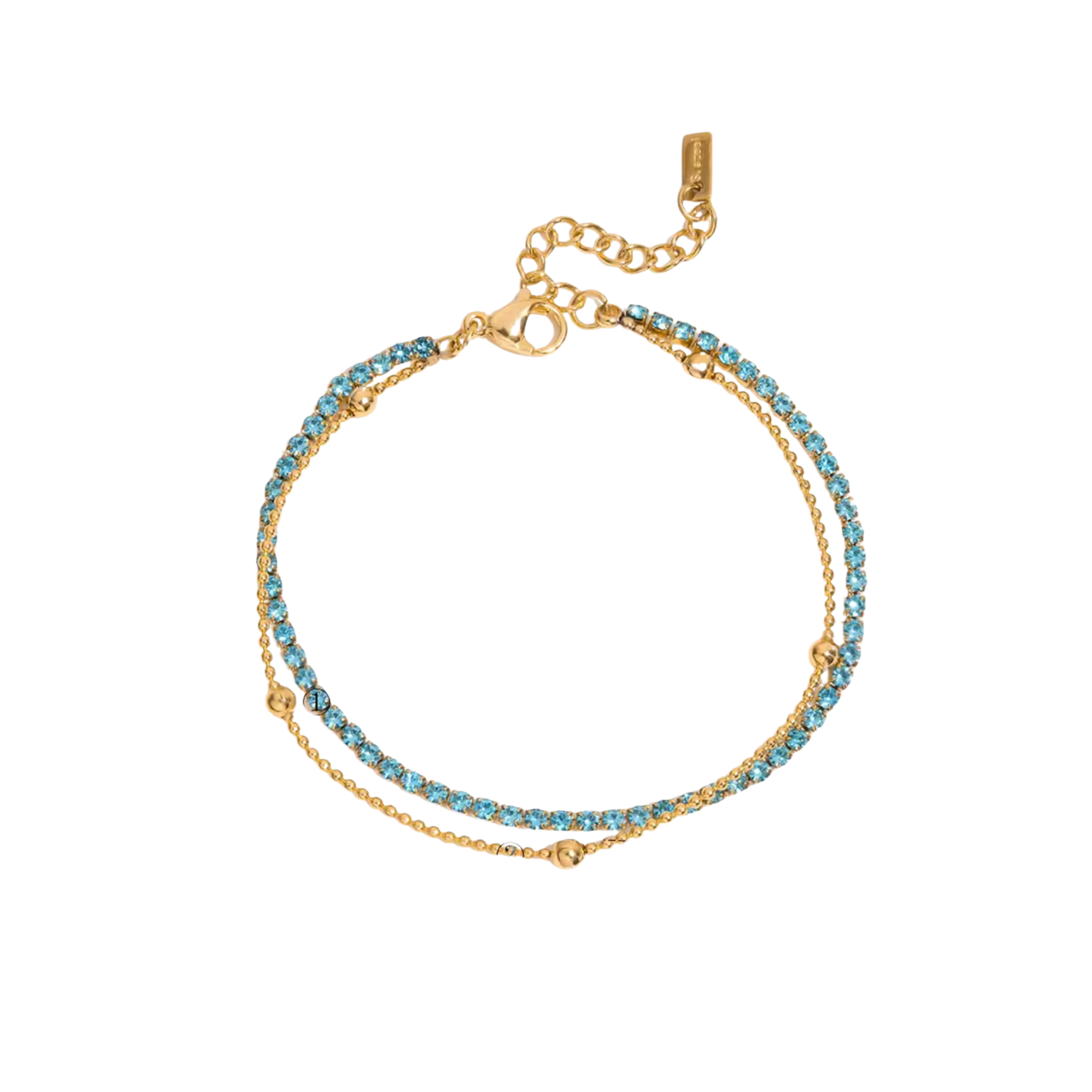 El brazalete doble de tenis en color turquesa con detalles dorados presenta un diseño elegante y sofisticado. Fabricado con materiales de alta calidad, ofrece durabilidad y resistencia. Ideal para complementar atuendos formales e informales, su acabado brillante aporta un toque distintivo a cualquier look. 💎✨