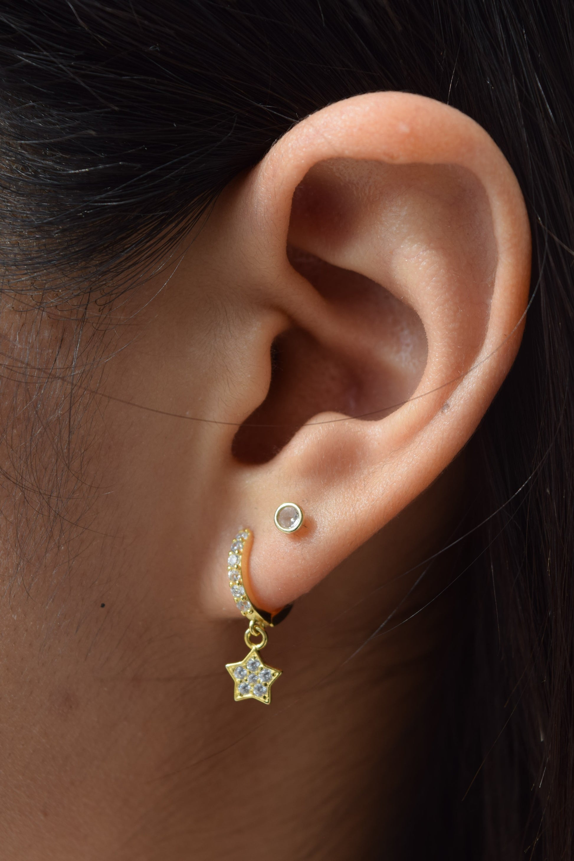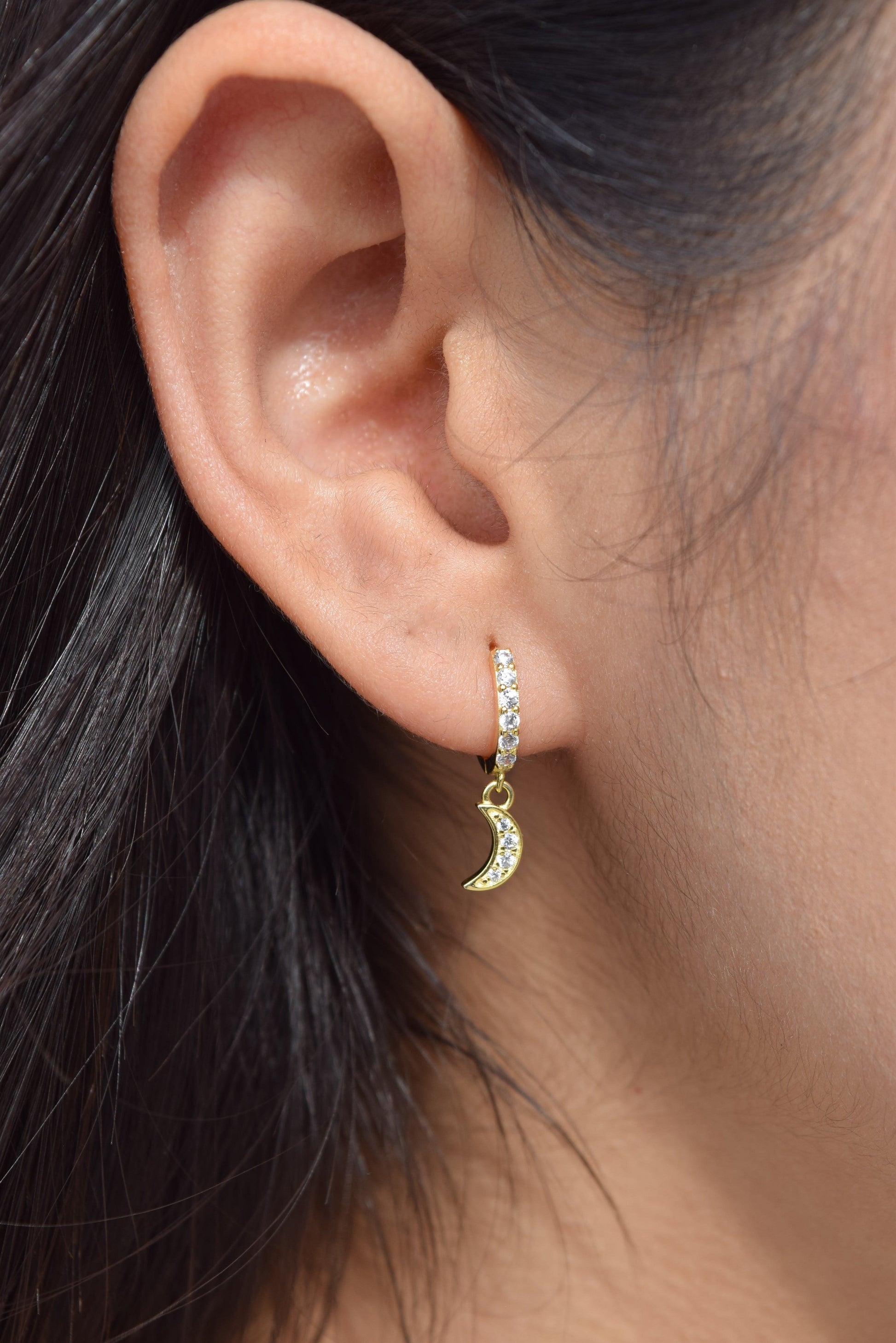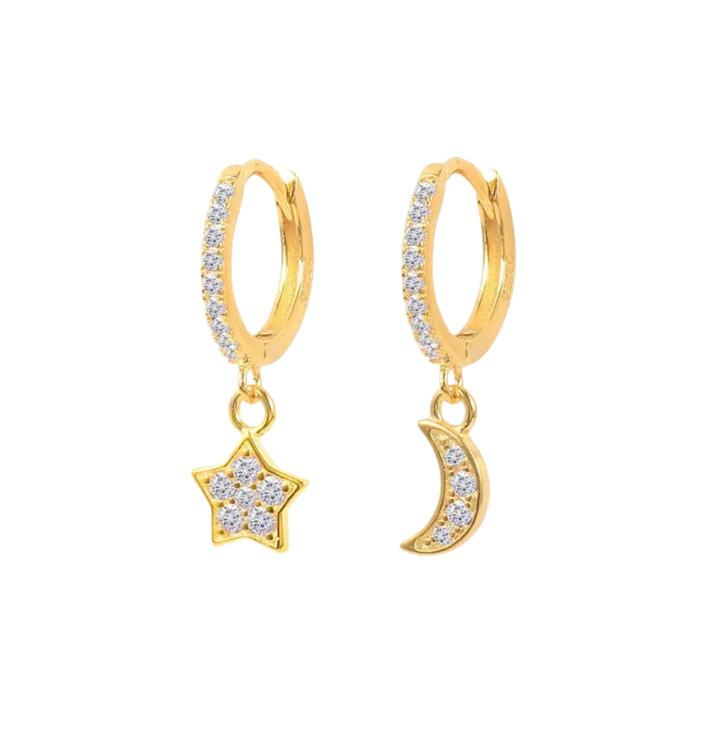 Arracadas pequeñas con colgantes en forma de luna y estrella.