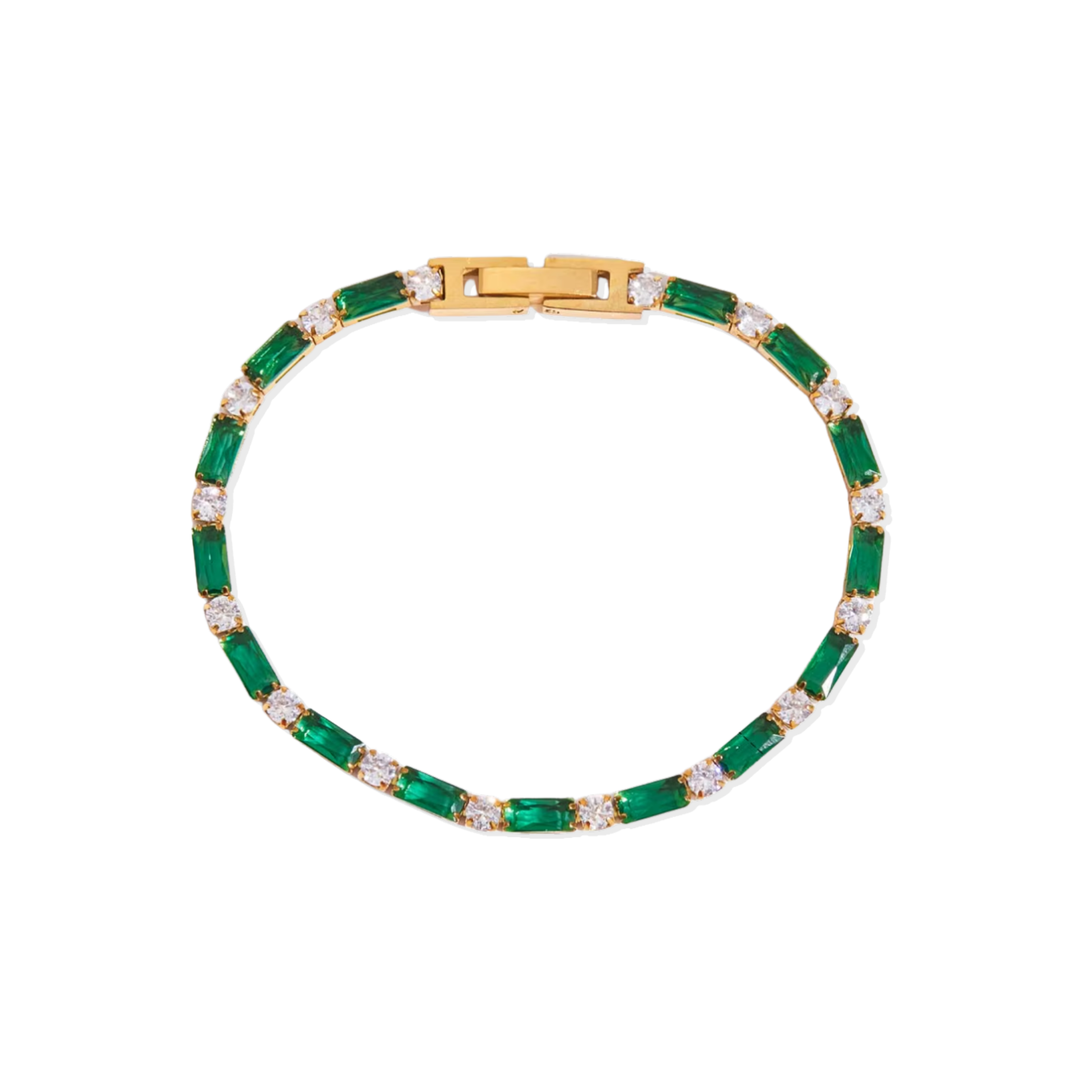 Pulsera dorada con detalles en verde que combina elegancia y estilo contemporáneo. Perfecta para complementar tu look diario o de fiesta. Los cristales baguette brillan con cada movimiento, dándote ese toque sofisticado que buscas. 💚✨ Ajustable y cómoda, esta pieza es tu nueva obsesión en accesorios. ¡Brilla con confianza! 💫
