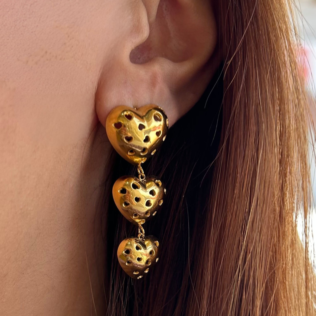 Añade un toque de romance a tu look con estos aretes triple corazones largos dorados 💛 Perfectos para cualquier ocasión, su diseño elegante y moderno te hará destacar. Hechos con material de alta calidad, duraderos y resistentes.